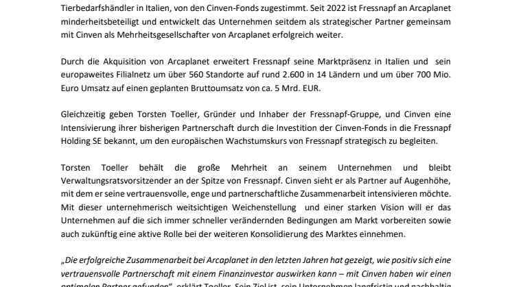 „Die erfolgreiche Zusammenarbeit bei Arcaplanet in den letzten Jahren hat gezeigt, wie positiv sich eine vertrauensvolle Partnerschaft mit einem Finanzinvestor auswirken kann – mit Cinven haben wir einen optimalen Partner gefunden“, erklärt Toeller. Sein Ziel ist, sein Unternehmen langfristig und nachhaltig erfolgreich für die Zukunft aufzustellen und den Kundinnen und Kunden von Fressnapf ein erstklassiges (Omnichannel-) Einkaufserlebnis zu bieten. „Wir haben mit der strategischen Neu-Positionierung vom Versorger zum Umsorger den richtigen Weg eingeschlagen!“, so Toeller weiter. “Wir wollen zukünftig nicht weniger als der beste und wachstumsstärkste Tierbedarfshändler in Europa sein. Ich bin stolz auf unsere 20.000 Mitarbeiterinnen und Mitarbeitern aus 50 Nationen, die täglich alles dafür geben unsere 20 Mio. Kundinnen und Kunden zu begeistern, und damit das Zusammenleben von Mensch und Tier einfacher, besser und glücklicher machen”, erläutert er die Mission des Unternehmens.
