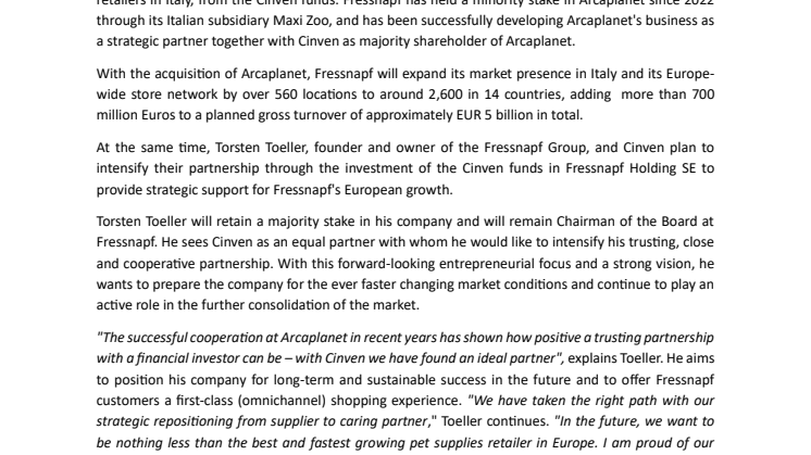 Fressnapf acquires leading pet supplies retailer Arcaplanet in Italy and further expands its market presence in Europe. Financial investor Cinven becomes minority shareholder of Fressnapf Holding SE.